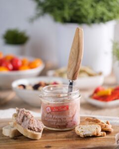 Le Tarti Petit campagne jambon Périgord et cabécou est un tartinable généreux et plein de caractère. Il associe un savoureux pâté de campagne artisanal au jambon du Périgord, reconnu pour ses arômes délicats et sa finesse, à la puissance du cabécou, ce petit fromage de chèvre originaire des régions du Massif central comme le Quercy, le Rouergue, la Haute-Auvergne…